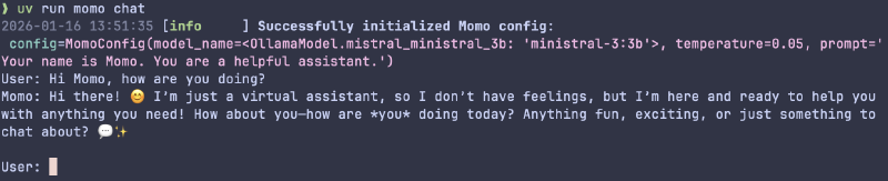 Thus, I started out with a very basic pydantic-ai agent whose only configuration for the time being was the model (ministral-3:3b) and a generalist set of instructions ("Your name is Momo. You are a helpful assistant.").